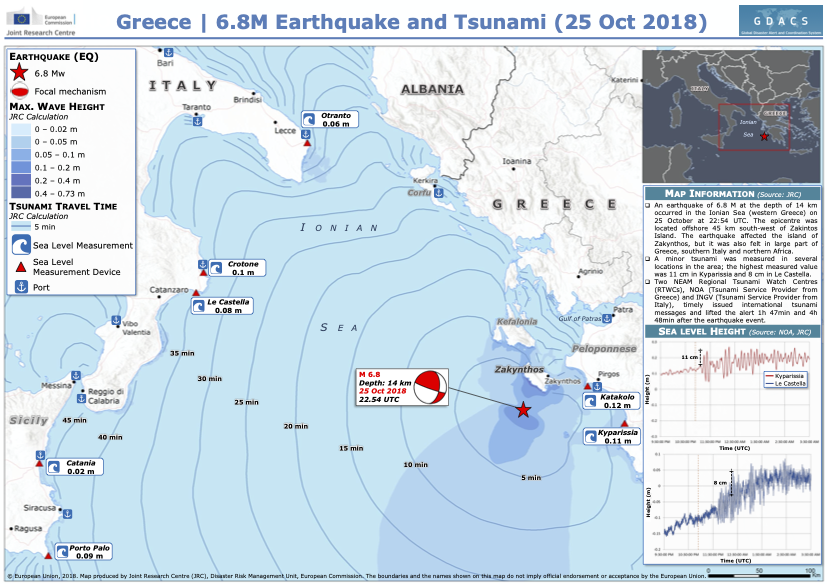 An earthquake of 6.8 M at the depth of 14 km occurred in the Ionian Sea (western Greece) on 25 October at 22:54 UTC. The epicentre was located offshore 45 km south-west of Zakintos Island. The earthquake affected the island of Zakynthos, but it was also felt in large part of Greece, southern Italy and northern Africa.