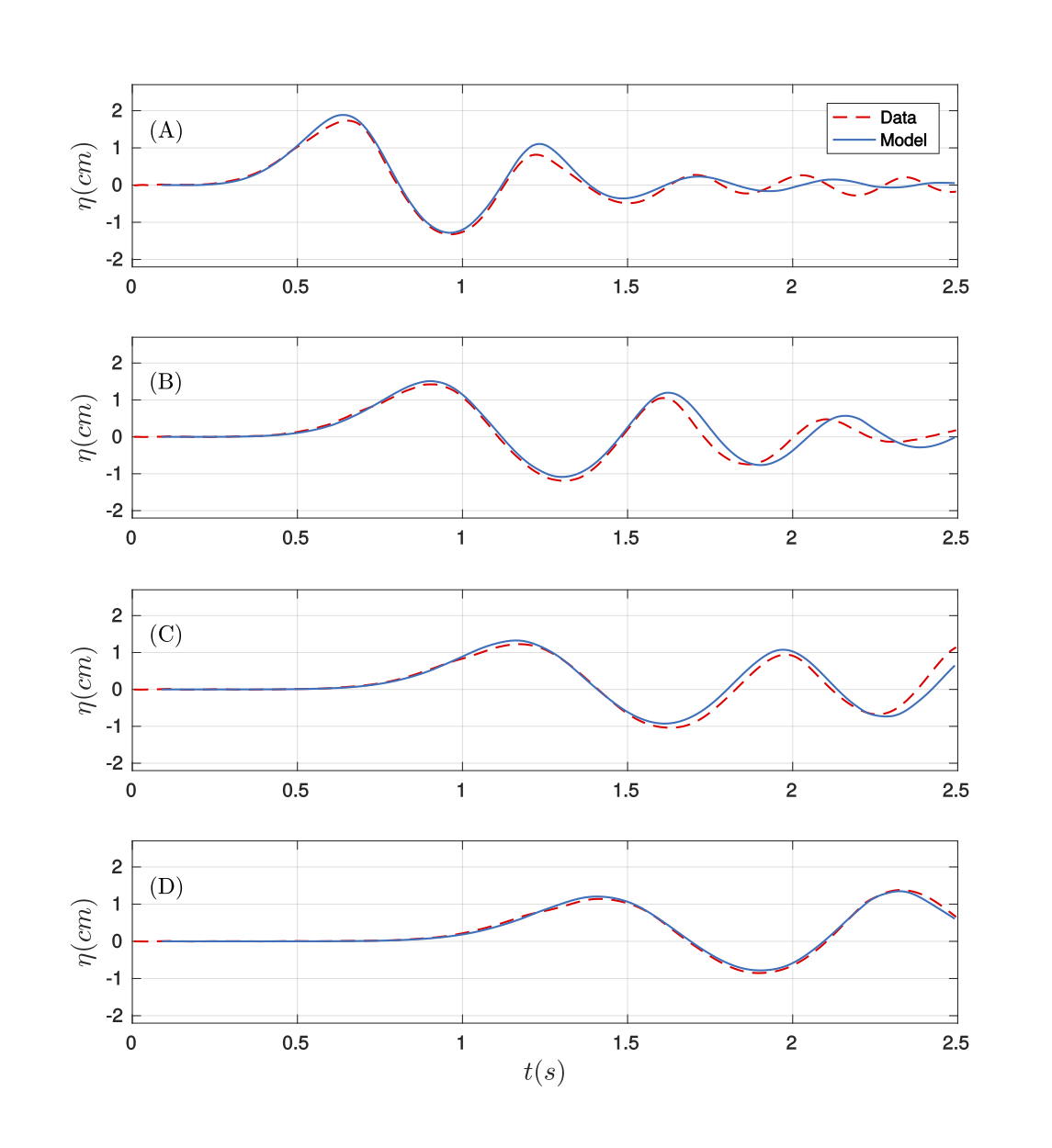 Figure 12. Comparison of data time series (red) and numerical (blue). Case 1. (A) G1, (B) G2, (C) G3, and (D) G4.