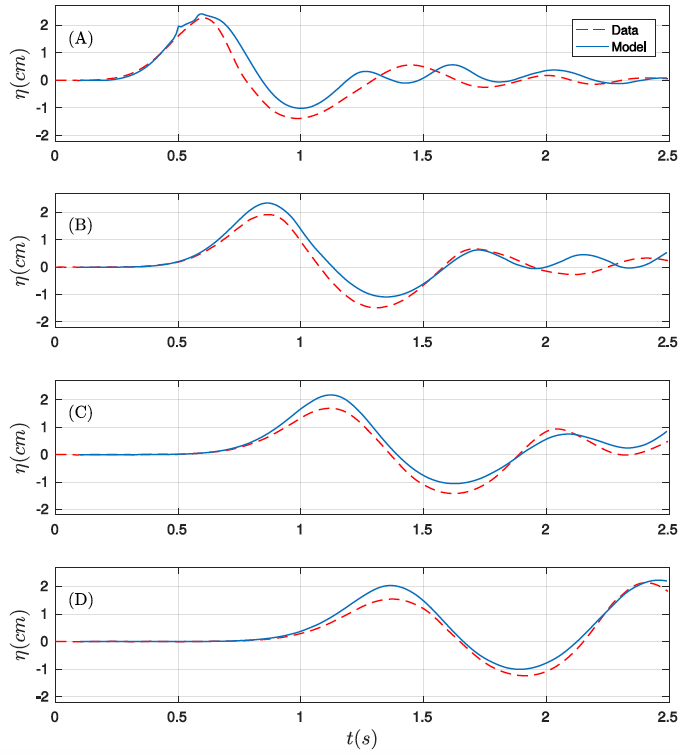 Figure 13. Comparison of data time series (red) and numerical (blue). Case 2. (A) G1, (B) G2, (C) G3, and (D) G4