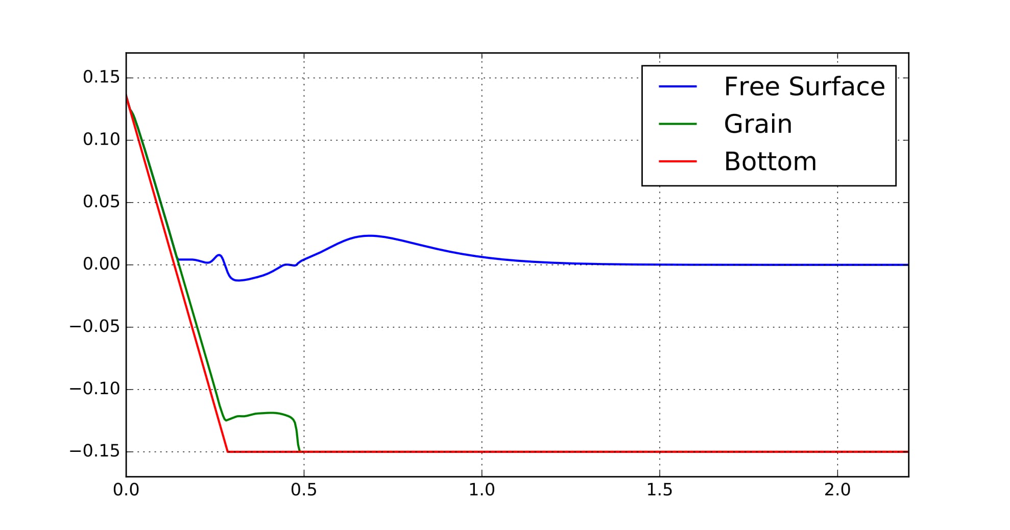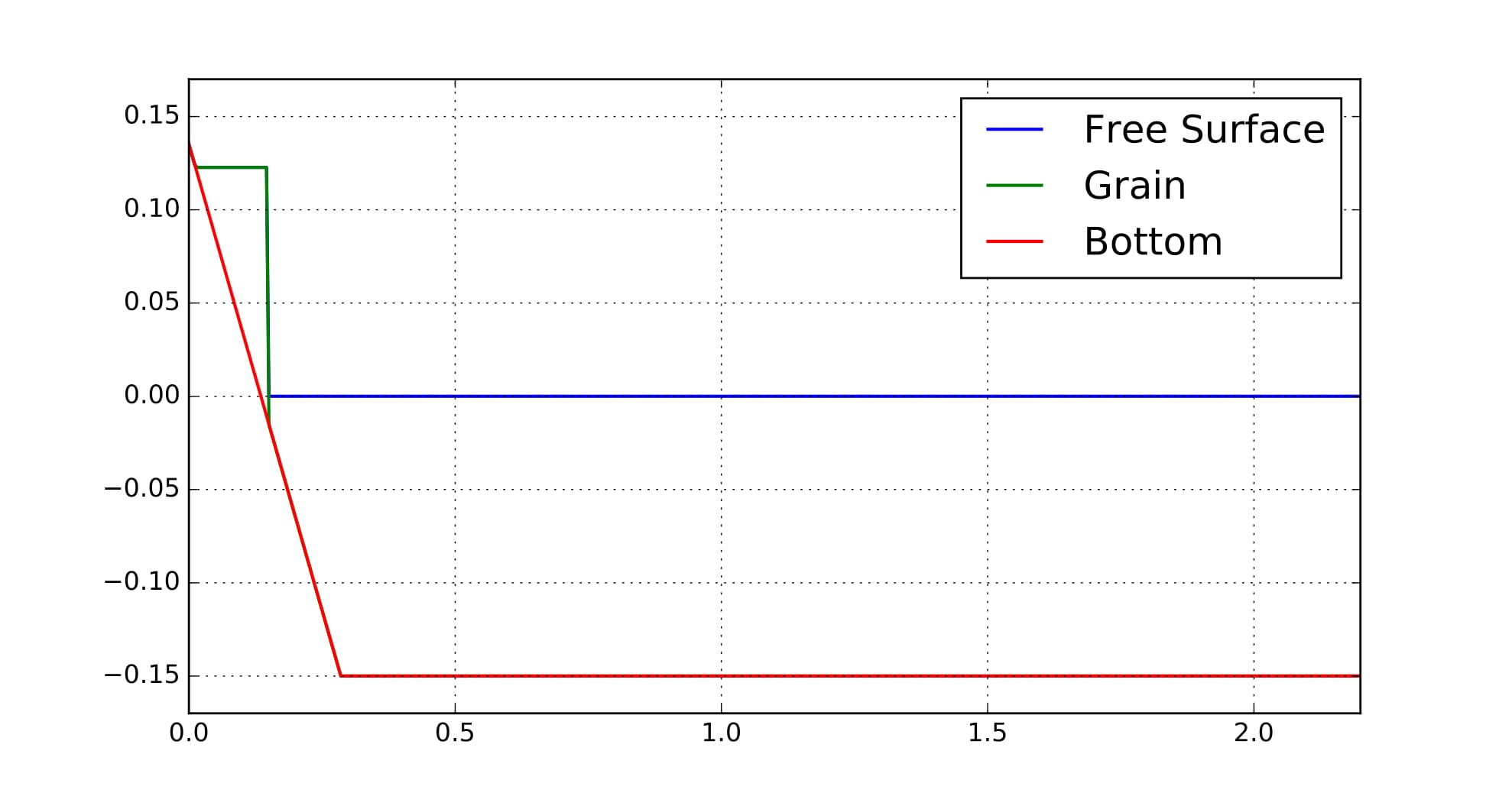 Two-dimensional subaerial granular slide For this benchmark we use the same model configuration as in the former problem: the Multilayer-HySEA (non-hydrostatic) model coupled with a Savage-Hutter model for the granular material (the latter is the same as the one implemented in the Landslide-HySEA model). The resulting model is weakly coupled, and the water feels the moving bottom, but the slide material is not affected by the gradient variations of water surface. The number of layers was set up to 3.