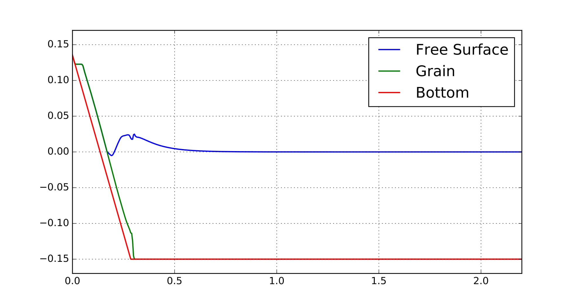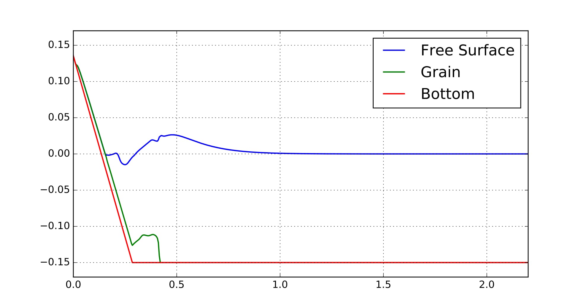 Figure 12 shows the comparison for Case 1 (D = 1.5 mm, H = 14.8 cm and L = 11 cm). Figure 13 shows the comparison for Case 2 (D = 10 mm, H = 15 cm and L = 13.5 cm). Figure 14 depicts the free surface elevation and the granular layer location at several times for Case 1. It can be observed that the agreement with lab data is much better for Case 1 than for Case 2 and also that this agreement is also better for gauges located further from the slide. This latter behavior can be explained as a consequence of the fact that the hydrodynamic component is much better resolved and simulated than the morphodynamic component (the movement of the slide material), obviously much more difficult to reproduce.