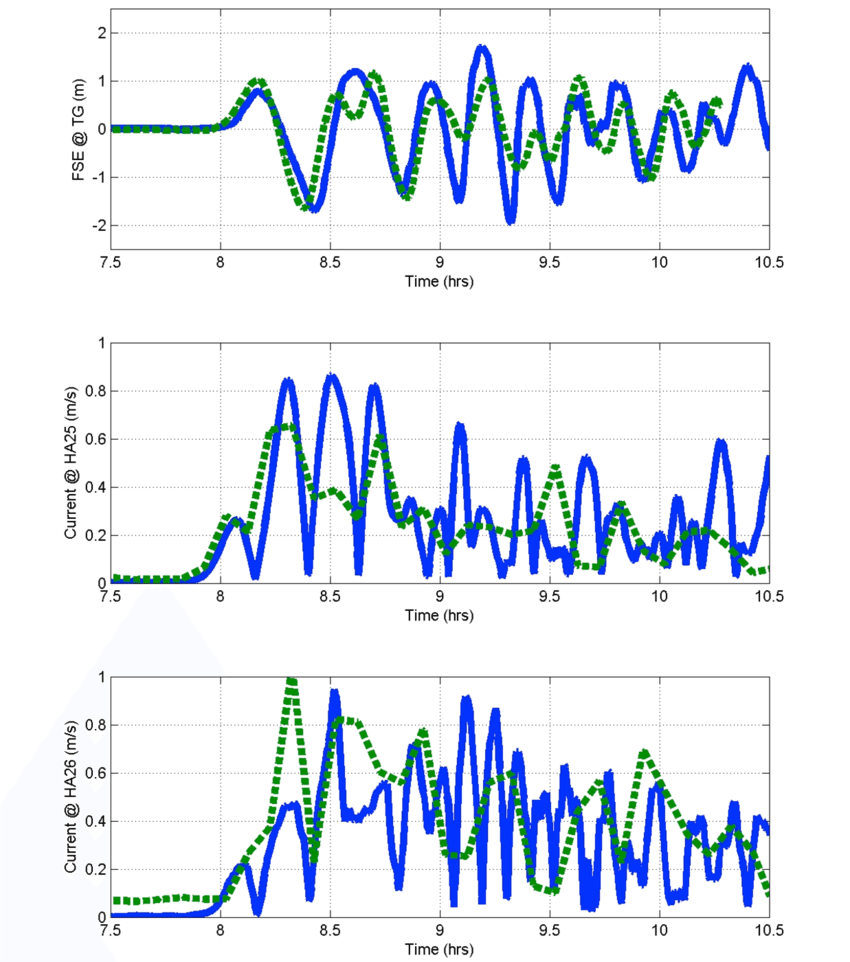 Figure 2. Measured data (dashed line) and numerical simulation (solid line) at the harbor tide gage (top), HA25 ADCP (middle), and HA26 ADCP (bottom).