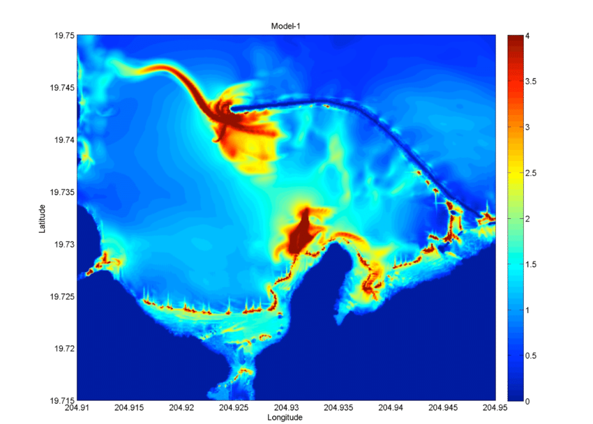 Figure 3. Maximum predicted fluid speed during entire duration of the 10-m resolution simulation.
